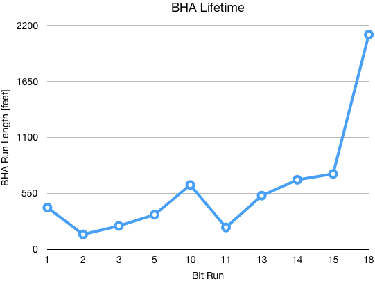 The BHA durability chart only includes runs that ended because of bit wear. Once bits become more durable, runs are more likely to end because of casing points or other activities. As is typical with drilling in a new area, early bit runs are suboptimal. Improvement comes through testing different designs informed by the performance of previous bits.