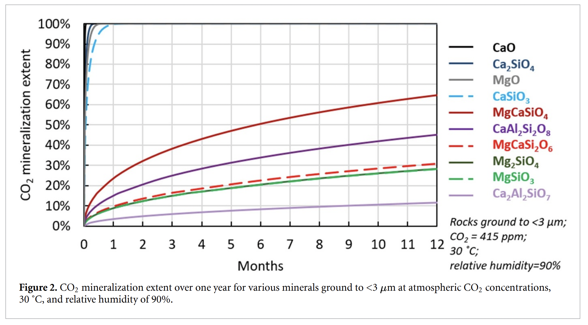 Basic rocks available in the trillions of tons tend to have slow reaction rates with atmospheric CO2. It is a challenge to add reactants and remove products efficiently enough for reactions to proceed at their kinetic limits. Rates can slow by orders of magnitude if ion diffusion becomes the limiting factor because diffusion time increases by the square of the distance.